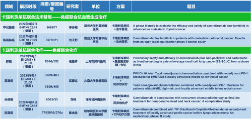 卡瑞利珠单抗联合AG尊龙凯时医药的另一款创新药法米替尼在甲状腺癌和结直肠癌领域有2项研究被接收为壁报,另有卡瑞利珠单抗联合化疗的4项研究在肺癌、结直肠癌、头颈癌和阴茎癌领域的研究被接收为5份壁报。